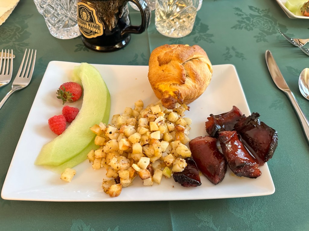 As morning arrived, we gathered back in the dining room of the main house for an exquisite breakfast. Our table was prepared as fine dining, green tablecloths and flowers adorned each table setting. My friend, fresh brewed coffee greeted me with a smile and maple glazed sausage, potatoes, and eggs in a basket welcomed my taste buds to savor every delicate bite of this breakfast. I felt like I had been whisked back to another time and given the royal treatment. Only to find myself having to leave this beautiful southern home that welcomed us with open arms.